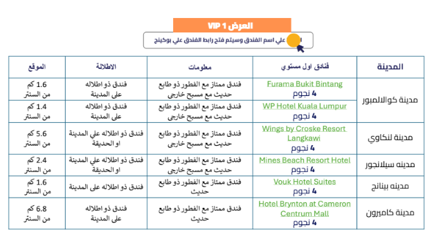 - الإقامة: 2 ليلة كوالالمبور – 2 ليلة مرتفعات كاميرون – 2 ليلة بينانج – 3 ليالي لنكاوي.