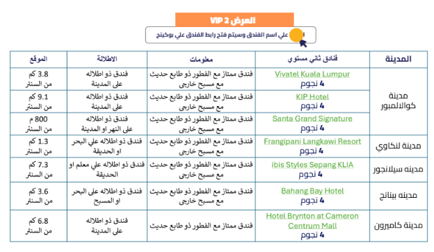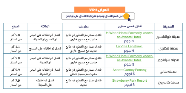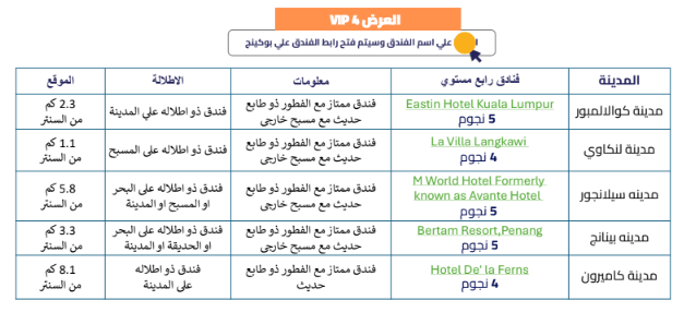 - الإقامة: 2 ليلة كوالالمبور – 2 ليلة لنكاوي – 3 ليالي بينانج.