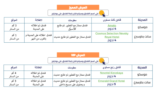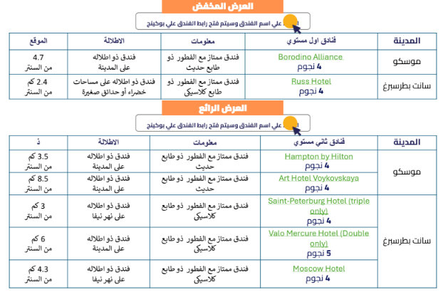 - الإقامة: 6 ليالي موسكو أو 2 ليالي موسكو + 2 ليالي سانت بطرسبرغ + 2 ليالي موسكو.